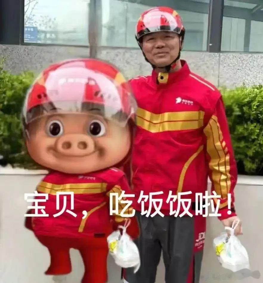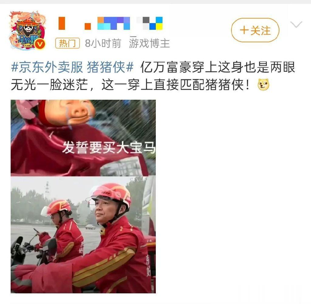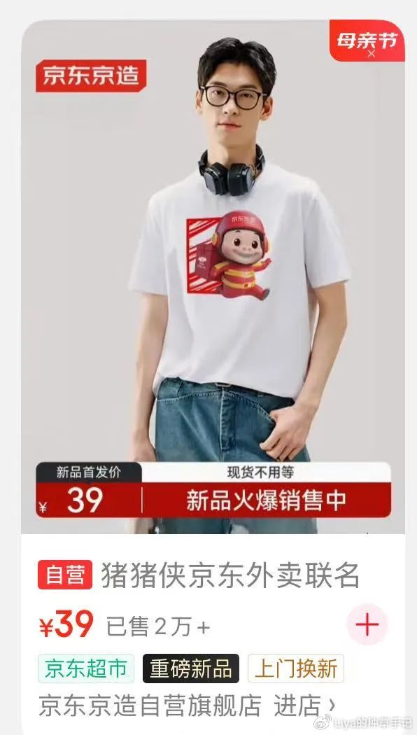 图源:猪猪侠官微官方下场后更是将网友的情绪推至巅峰,网友都开始喊话京东快接住这泼天的流量!京东也不负众望,反应能力堪称教科书级别。立马官宣联名并坐实了“猪猪侠”的外卖员身份,同时推出了联名T恤等周边,也就是刘强东身上的这件,直接把全民玩梗变成了自家生意。